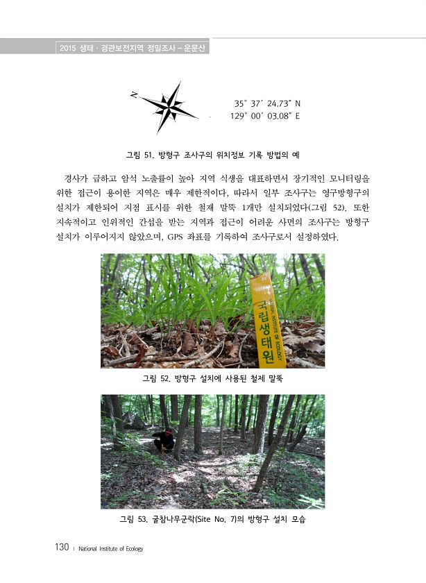 2015 생태·경관보전지역 정밀조사 운문산 130 ? National Institute of Ecology 35°37′24.73″N 129°00′03.08″E 그림 51. 방형구 조사구의 위치정보 기록 방법의 예 경사가 급하고 암석 노출률이 높아 지역 식생을 대표하면서 장기적인 모니터링을 위한 접근이 용이한 지역은 매우 제한적이다, 따라서 일부 조사구는 영구방형구의 설치가 제한되어 지점 표시를 위한 철재 말뚝 1개만 설치되었다 그림 52 또한 지속적이고 인위적인 간섭을 받는 지역과 접근이 어려운 사면의 조사구는 방형구 설치가 이루어지지 않았으며, GPS 좌표를 기록하여 조사구로서 설정하였다. 그림 52. 방형구 설치에 사용된 철제 말뚝 그림 53. 굴참나무군락 Site No. 7 의 방형구 설치모습