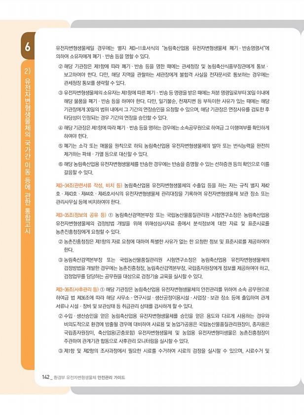 142 _ 환경부 유전자변형생물체 안전관리 가이드 6 유전자변형생물체의 국가간 이동 등에 관한 통합고시 2 유전자변형생물체일 경우에는 별지 제3-11호서식의 “농림축산업용 유전자변형생물체 폐기·반송명령서”에 의하여 소유자에게 폐기·반송 등을 명할 수 있다. ② 해당 기관장은 제1항에 따라 폐기·반송 등을 명한 때에는 관세청장 및 농림축산식품부장관에게 통보· 보고하여야 한다. 다만, 해당 지역을 관할하는 세관장에게 불합격 사실을 전자문서로 통보하는 경우에는 관세청장 통보를 생략할 수 있다. ③ 유전자변형생물체의 소유자는 제1항에 따른 폐기·반송 등 명령을 받은 때에는 처분 명령일로부터 30일 이내에 해당 물품을 폐기·반송 등을 하여야 한다. 다만, 일기불순, 천재지변 등 부득이한 사유가 있는 때에는 해당 기관...