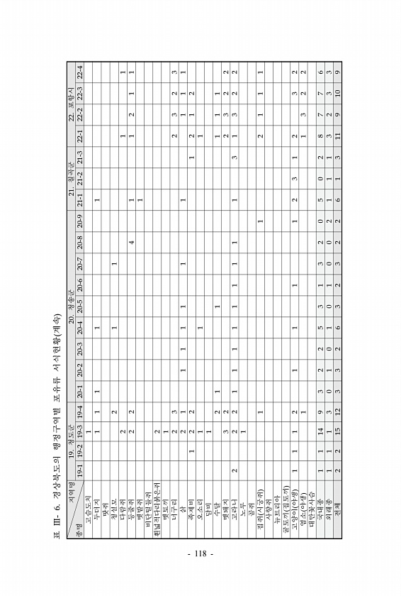 표 Ⅲ- 6. 경상북도의 행정구역별 포유류 서식현황 계속 지역명 종명 19. 청도군 20. 청송군 21. 칠곡군 22. 포항시 19-1 19-2 19-3 19-4 20-1 20-2 20-3 20-4 20-5 20-6 20-7 20-8 20-9 21-1 21-2 21-3 22-1 22-2 22-3 22-4 고슴도치 1 두더지 1 1 1 1 1 땃쥐 청설모 2 1 1 다람쥐 2 1 1 등줄쥐 2 2 4 1 1 2 1 1 멧밭쥐 1 비단털들쥐 흰넓적다리붉은쥐 2 멧토끼 1 너구리 2 3 2 3 2 3 삵 2 1 1 1 1 1 1 1 1 1 1 족제비 1 2 2 1 2 1 2 오소리 1 1 1 담비 1 수달 2 1 1 1 1 1 멧돼지 3 2 2 3 2 2 고라니 2 2 2 1 1 1 1 1 1 1 1 1 3 1 ...