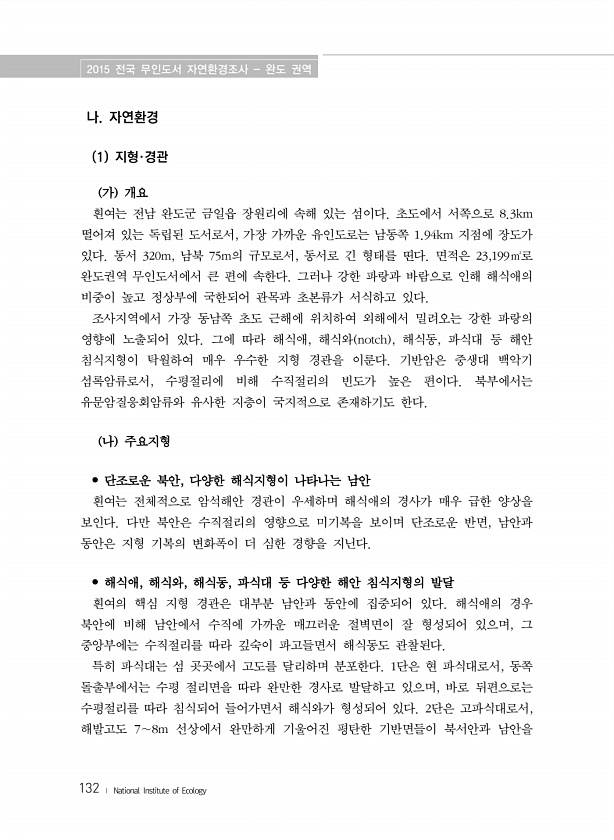2015 전국 무인도서 자연환경조사 완도 권역 132 ? National Institute of Ecology 나. 자연환경 1 지형·경관 가 개요 흰여는 전남 완도군 금일읍 장원리에 속해 있는 섬이다. 초도에서 서쪽으로 8.3km 떨어져 있는 독립된 도서로서, 가장 가까운 유인도로는 남동쪽 1.94km 지점에 장도가 있다. 동서 320m, 남북 75m의 규모로서, 동서로 긴 형태를 띤다. 면적은 23,199㎡로 완도권역 무인도서에서 큰 편에 속한다. 그러나 강한 파랑과 바람으로 인해 해식애의 비중이 높고 정상부에 국한되어 관목과 초본류가 서식하고 있다. 조사지역에서 가장 동남쪽 초도 근해에 위치하여 외해에서 밀려오는 강한 파랑의 영향에 노출되어 있다. 그에 따라 해식애, 해식와 notch , 해식동, 파식...