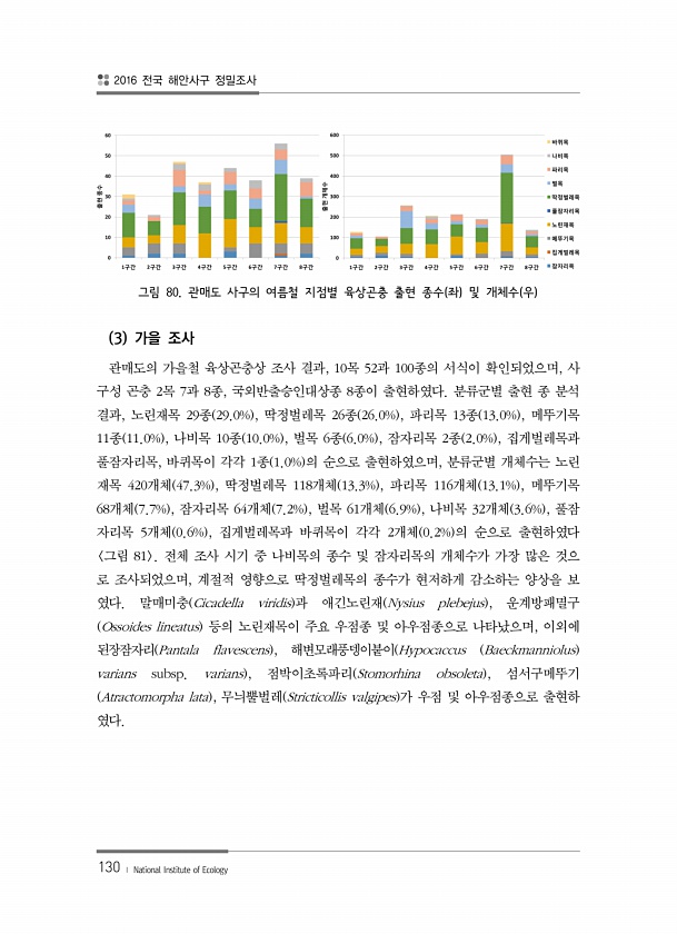 2016 전국 해안사구 정밀조사 130 ? National Institute of Ecology 그림 80. 관매도 사구의 여름철 지점별 육상곤충 출현 종수 좌 및 개체수 우 3 가을 조사 관매도의 가을철 육상곤충상 조사 결과, 10목 52과 100종의 서식이 확인되었으며, 사 구성 곤충 2목 7과 8종, 국외반출승인대상종 8종이 출현하였다. 분류군별 출현 종 분석 결과, 노린재목 29종 29.0% , 딱정벌레목 26종 26.0% , 파리목 13종 13.0% , 메뚜기목 11종 11.0% , 나비목 10종 10.0% , 벌목 6종 6.0% , 잠자리목 2종 2.0% , 집게벌레목과 풀잠자리목, 바퀴목이 각각 1종 1.0% 의 순으로 출현하였으며, 분류군별 개체수는 노린 재목 420개체 47.3% , 딱정벌레...