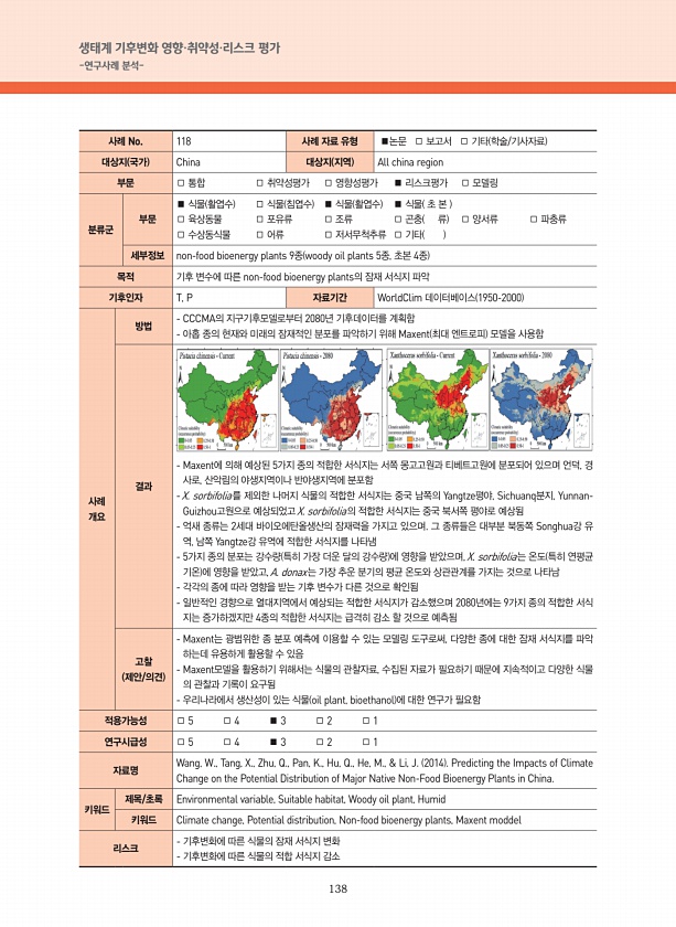 138 생태계 기후변화 영향·취약성·리스크 평가 -연구사례 분석- 사례 No. 118 사례 자료 유형 ■논문 □ 보고서 □ 기타 학술/기사자료 대상지 국가 China 대상지 지역 All china region 부문 □ 통합 □ 취약성평가 □ 영향성평가 ■ 리스크평가 □ 모델링 분류군 부문 ■ 식물 활엽수 □ 식물 침엽수 ■ 식물 활엽수 ■ 식물 초 본 □ 육상동물 □ 포유류 □ 조류 □ 곤충 류 □ 양서류 □ 파충류 □ 수상동식물 □ 어류 □ 저서무척추류 □ 기타 세부정보 non-food bioenergy plants 9종 woody oil plants 5종, 초본 4종 목적 기후 변수에 따른 non-food bioenergy plants의 잠재 서식지 파악 기후인자 T, P 자료기간 WorldClim 데이...