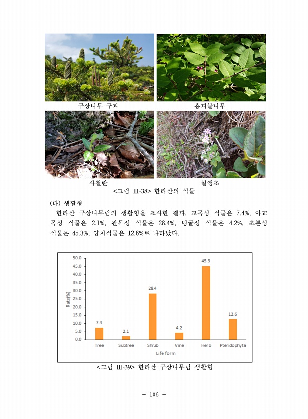 106 구상나무 구과 홍괴불나무 사철란 설앵초 그림 Ⅲ-38 한라산의 식물 다 생활형 한라산 구상나무림의 생활형을 조사한 결과, 교목성 식물은 7.4%, 아교 목성 식물은 2.1%, 관목성 식물은 28.4%, 덩굴성 식물은 4.2%, 초본성 식물은 45.3%, 양치식물은 12.6%로 나타났다. 그림 Ⅲ-39 한라산 구상나무림생활형