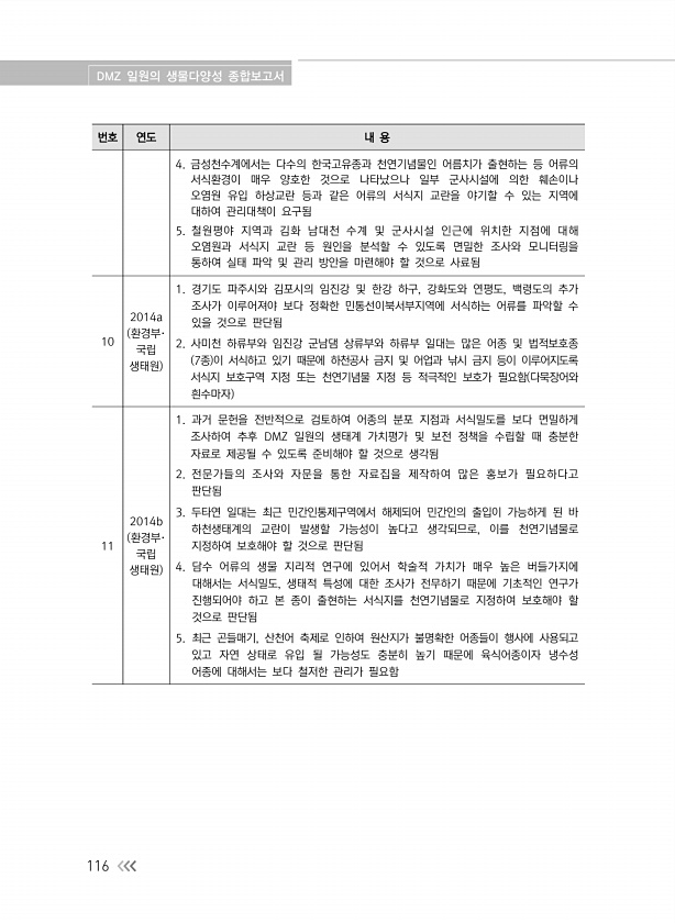 DMZ 일원의 생물다양성 종합보고서 116 번호 연도 내 용 4. 금성천수계에서는 다수의 한국고유종과 천연기념물인 어름치가 출현하는 등 어류의 서식환경이 매우 양호한 것으로 나타났으나 일부 군사시설에 의한 훼손이나 오염원 유입 하상교란 등과 같은 어류의 서식지 교란을 야기할 수 있는 지역에 대하여 관리대책이 요구됨 5. 철원평야 지역과 김화 남대천 수계 및 군사시설 인근에 위치한 지점에 대해 오염원과 서식지 교란 등 원인을 분석할 수 있도록 면밀한 조사와 모니터링을 통하여 실태 파악 및 관리 방안을 마련해야 할 것으로 사료됨 10 2014a 환경부· 국립 생태원 1. 경기도 파주시와 김포시의 임진강 및 한강 하구, 강화도와 연평도, 백령도의 추가 조사가 이루어져야 보다 정확한 민통선이북서부지역에 서식하는 어...