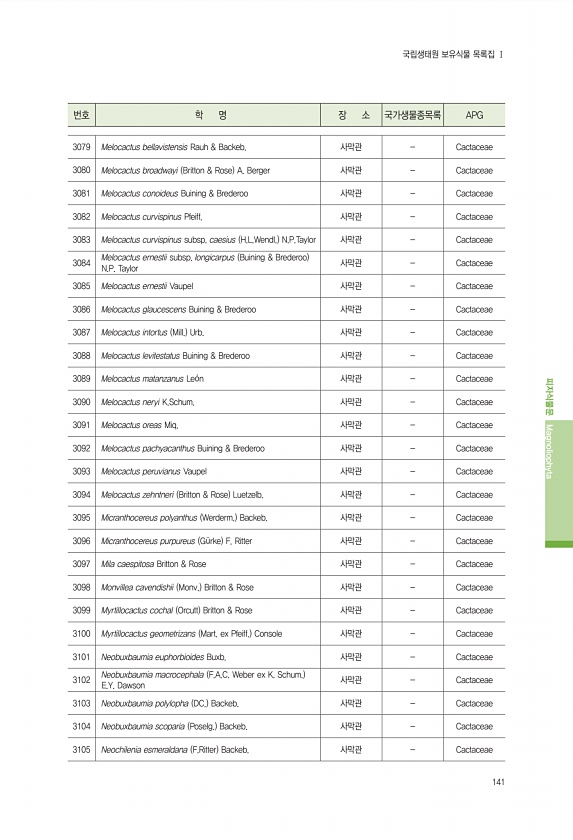 141 번호 학 명 장 소 국가생물종목록 APG 피자식물문 Magnoliophyta 국립생태원 보유식물 목록집 Ⅰ 3079 Melocactus bellavistensis Rauh & Backeb. 사막관 Cactaceae 3080 Melocactus broadwayi Britton & Rose A. Berger 사막관 Cactaceae 3081 Melocactus conoideus Buining & Brederoo 사막관 Cactaceae 3082 Melocactus curvispinus Pfeiff. 사막관 Cactaceae 3083 Melocactus curvispinus subsp. caesius H.L.Wendl. N.P.Taylor 사막관 Cactaceae 3084 Melocactus ernesti...