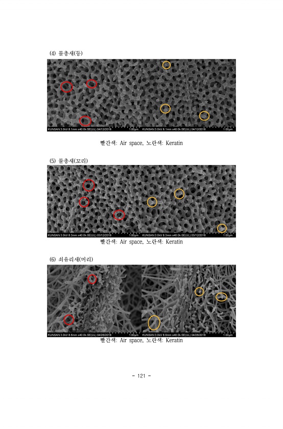 121 4 물총새 등 빨간색Air space, 노란색Keratin 5 물총새 꼬리 빨간색Air space, 노란색Keratin 6 쇠유리새 머리 빨간색Air space, 노란색Keratin
