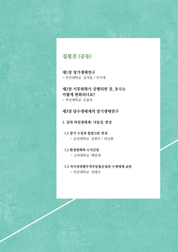 담수생태계, 기후변화와 환경교란 141 집필진 공동 제1장 장기생태연구 부산대학교 김지윤 주기재 제2장 기후변화가 진행되면 강, 호수는 어떻게 변화되나요? 부산대학교 도윤호 제3장 담수생태계의 장기생태연구 1. 강과 하천생태계낙동강, 한강 1.1 장기 수질과 플랑크톤 번성 순천대학교 김현우 라긍환 1.2 환경변화와 수서곤충 고려대학교 배연재 1.3 저서성대형무척추동물군집과 수생태계 교란 부산대학교전태수