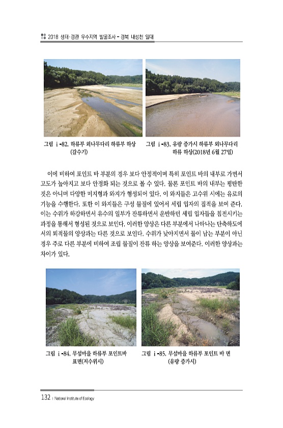 2018 생태·경관 우수지역 발굴조사 경북 내성천 일대 132 ? National Institute of Ecology 그림 ⅰ-82. 하류부 외나무다리 하류부 하상 갈수기 그림 ⅰ-83. 유량 증가시 하류부 외나무다리 하류 하상 2018년 6월 27일 이에 비하여 포인트 바 부분의 경우 보다 안정적이며 특히 포인트 바의 내부로 가면서 고도가 높아지고 보다 안정화 되는 것으로 볼 수 있다. 물론 포인트 바의 내부는 평탄한 것은 아니며 다양한 미지형과 와지가 형성되어 있다. 이 와지들은 고수위 시에는 유로의 기능을 수행한다. 또한 이 와지들은 구성 물질에 있어서 세립 입자의 집적을 보여 준다. 이는 수위가 하강하면서 유수의 일부가 잔류하면서 운반하던 세립 입자들을 침전시키는 과정을 통해서 형성된 것으로 보인다...