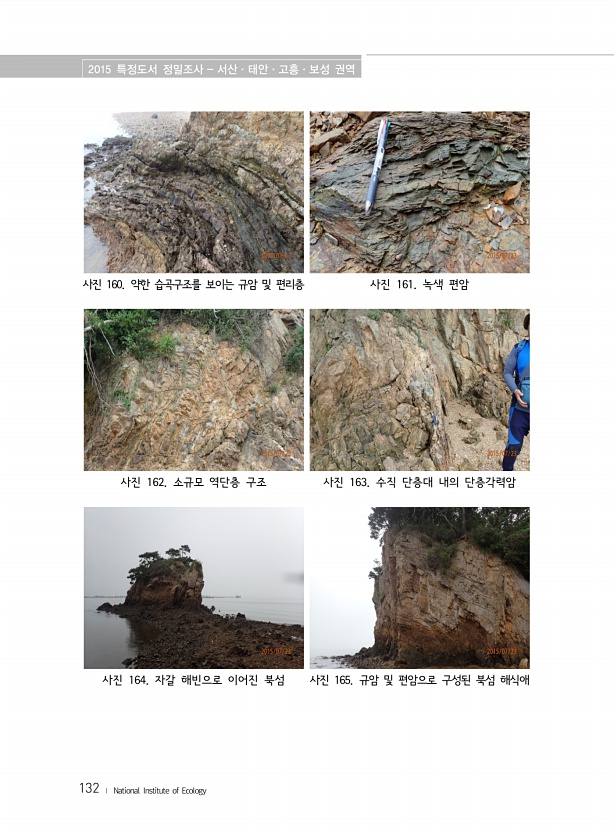2015 특정도서 정밀조사 서산·태안·고흥·보성 권역 132 ? National Institute of Ecology 사진 160. 약한 습곡구조를 보이는 규암 및 편리층 사진 161. 녹색 편암 사진 162. 소규모 역단층 구조 사진 163. 수직 단층대 내의 단층각력암 사진 164. 자갈 해빈으로 이어진 북섬 사진 165. 규암 및 편암으로 구성된 북섬해식애