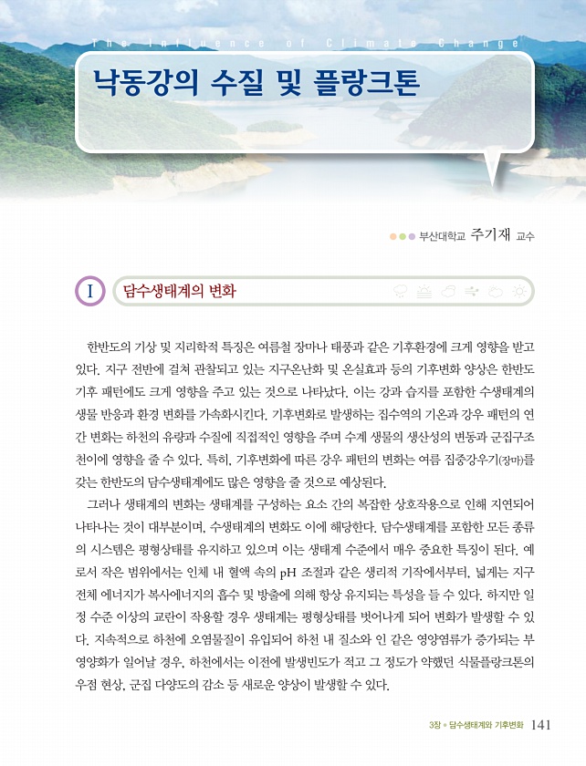 3장 담수생태계와 기후변화 141 I 담수생태계의 변화 한반도의 기상 및 지리학적 특징은 여름철 장마나 태풍과 같은 기후환경에 크게 영향을 받고 있다. 지구 전반에 걸쳐 관찰되고 있는 지구온난화 및 온실효과 등의 기후변화 양상은 한반도 기후 패턴에도 크게 영향을 주고 있는 것으로 나타났다. 이는 강과 습지를 포함한 수생태계의 생물 반응과 환경 변화를 가속화시킨다. 기후변화로 발생하는 집수역의 기온과 강우 패턴의 연 간 변화는 하천의 유량과 수질에 직접적인 영향을 주며 수계 생물의 생산성의 변동과 군집구조 천이에 영향을 줄 수 있다. 특히, 기후변화에 따른 강우 패턴의 변화는 여름 집중강우기 장마 를 갖는 한반도의 담수생태계에도 많은 영향을 줄 것으로 예상된다. 그러나 생태계의 변화는 생태계를 구성하는 요소 ...