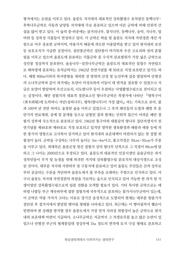 육상생태계에서 이루어지는 생태연구 141 평지에서는 순림을 이루고 있다. 울릉도 저지대의 대표적인 상록활엽수 유적림인 동백나무- 후박나무군락은 사동과 남양동 저지대에 주로 분포하고 있으며 다른 군락에 비해 인위적 간 섭을 많이 받고 있다. 이 숲의 중·하층에는 굴거리나무, 참식나무, 동백나무, 송악, 식나무, 털 머위 등 상록성 식물들이 번성하고 있다. 이 군락은 학술 및 울릉도 저지대 자연경관 개선 자 원으로 아주 중요한 군락이며, 약용가치 때문에 과도한 이용압력을 받고 있어 현지내외 보전 등 보호조치가 시급한 실정이다. 섬단풍군락은 섬단풍이 마가목과 우산 고로쇠와 섞여 혼합 림을 이루고 있으며 울릉도에 분포하는 식물군락 중 수직적 분포범위가 가장 넓은 군락으로 성인봉 정상까지 분포한다. 솔송나무-섬잣나무...