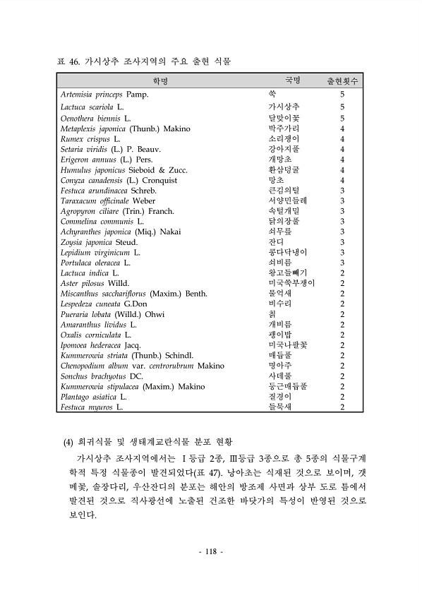 118 학명 국명 출현횟수 Artemisia princeps Pamp. 쑥 5 Lactuca scariola L. 가시상추 5 Oenothera biennis L. 달맞이꽃 5 Metaplexis japonica Thunb. Makino 박주가리 4 Rumex crispus L. 소리쟁이 4 Setaria viridis L. P. Beauv. 강아지풀 4 Erigeron annuus L. Pers. 개망초 4 Humulus japonicus Sieboid & Zucc. 환삼덩굴 4 Conyza canadensis L. Cronquist 망초 4 Festuca arundinacea Schreb. 큰김의털 3 Taraxacum officinale Weber 서양민들레 3 Agropyron ciliare Trin...