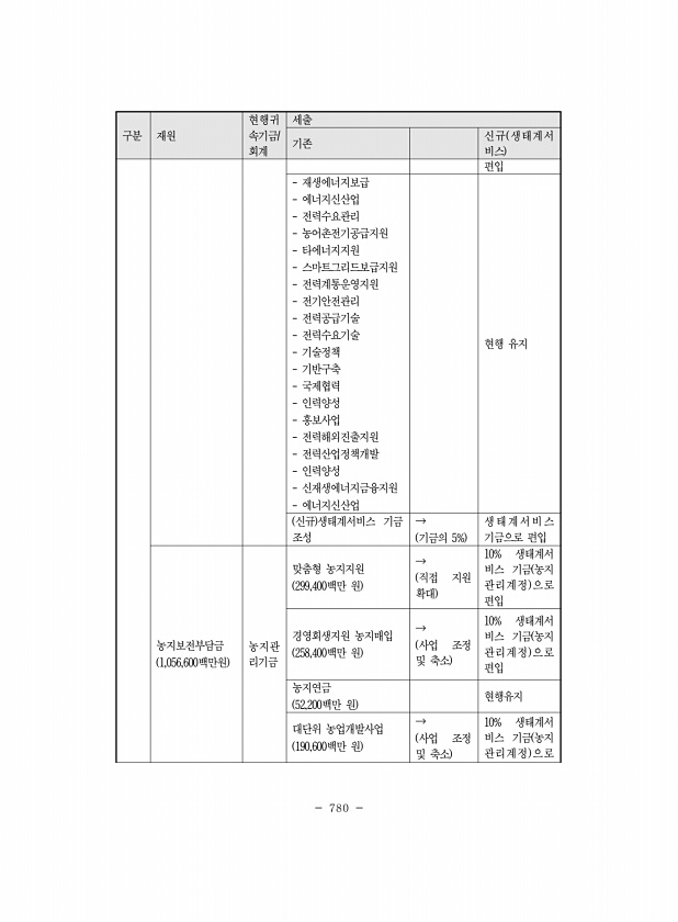 780 구분 재원 현행귀 속기금/ 회계 세출 기존 신규 생태계서 비스 편입 재생에너지보급 에너지신산업 전력수요관리 농어촌전기공급지원 타에너지지원 스마트그리드보급지원 전력계통운영지원 전기안전관리 전력공급기술 전력수요기술 기술정책 기반구축 국제협력 인력양성 홍보사업 전력해외진출지원 전력산업정책개발 인력양성 신재생에너지금융지원 에너지신산업 현행 유지 신규 생태계서비스 기금 조성 → 기금의 5% 생태계서비스 기금으로 편입 농지보전부담금 1,056,600백만원 농지관 리기금 맞춤형 농지지원 299,400백만 원 → 직접 지원 확대 10% 생태계서 비스 기금 농지 관리계정 으로 편입 경영회생지원 농지매입 258,400백만 원 → 사업 조정 및 축소 10% 생태계서 비스 기금 농지 관리계정 으로 편입 농지연금 52,20...
