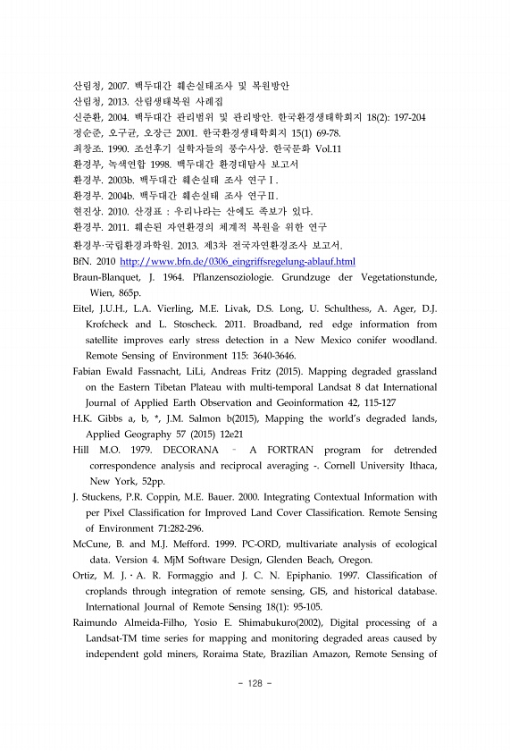 128 산림청, 2007. 백두대간 훼손실태조사 및 복원방안 산림청, 2013. 산림생태복원 사례집 신준환, 2004. 백두대간 관리범위 및 관리방안. 한국환경생태학회지 18 2 197-204 정순준, 오구균, 오장근 2001. 한국환경생태학회지 15 1 69-78. 최창조. 1990. 조선후기 실학자들의 풍수사상. 한국문화 Vol.11 환경부, 녹색연합 1998. 백두대간 환경대탐사 보고서 환경부. 2003b. 백두대간 훼손실태 조사 연구Ⅰ. 환경부. 2004b. 백두대간 훼손실태 조사 연구Ⅱ. 현진상. 2010. 산경표 우리나라는 산에도 족보가 있다. 환경부. 2011. 훼손된 자연환경의 체계적 복원을 위한 연구 환경부·국립환경과학원. 2013. 제3차 전국자연환경조사 보고서. BfN. 2010 http...