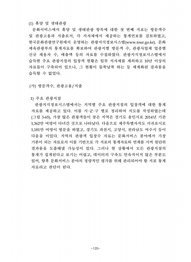 -120- 휴양 및 생태관광 문화서비스에서 휴양 및 생태관광 항목에 대한 첫 번째 지표는 방문객수 및 관광고용과 지출로서 각 지자체에서 제공하는 통계연보를 검토하였고 한국문화관광연구원에서 운영하는 관광지식정보시스템 문화 체육관광부의 통계자료를 확보하여 관광지별 방문객 수 관광사업체 업종별 신규 채용자 수 매출액 등의 자료를 수집하였다 관광지식정보시스템에서 습득한 주요 관광지점의 입장객 현황은 일부 지자체를 제외하고 년 이상의 자료들이 구축되어 있으나 그 현황이 들쭉날쭉 하는 등 체계화된 결과물을 습득할 수 없었다 가 방문객수 관광고용 지출 주요 관광지점 관광지식정보시스템에서는 지역별 주요 관광지점의 입장객에 대한 통계 자료를 제공하고 있다 이를 시 군 구 별로 정리하여 지도를 작성하였는데 그림 가장 많은 관...