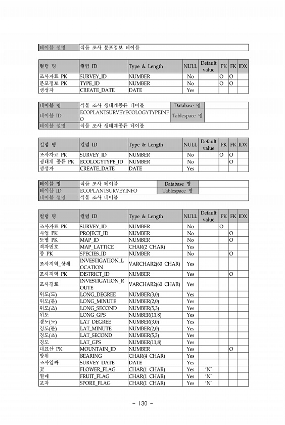 130 테이블 설명 식물 조사 분포정보 테이블 컬럼 명 컬럼 ID Type & Length NULL Default value PK FK IDX 조사자료 PK SURVEY_ID NUMBER No O O 분포정보 PK TYPE_ID NUMBER No O O 생성자 CREATE_DATE DATE Yes 테이블 명 식물 조사 생태계종류 테이블 Database 명 테이블 ID ECOPLANTSURVEYECOLOGYTYPEINF O Tablespace 명 테이블 설명 식물 조사 생태계종류 테이블 컬럼 명 컬럼 ID Type & Length NULL Default value PK FK IDX 조사자료 PK SURVEY_ID NUMBER No O O 생태계 종류 PK ECOLOGYTYPE_ID NUMBER No O 생성자...