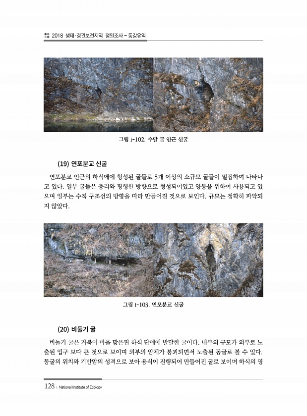 2018 생태·경관보전지역 정밀조사 동강유역 128 ? National Institute of Ecology 그림 i-102. 수달 굴 인근 신굴 19 연포분교 인근의 하식애에 형성된 굴들로 5개 이상의 소규모 굴들이 밀집하여 나타나 고 있다. 일부 굴들은 층리와 평행한 방향으로 형성되어있고 양봉을 위하여 사용되고 있 으며 일부는 수직 구조선의 방향을 따라 만들어진 것으로 보인다. 규모는 정확히 파악되 지 않았다. 그림 i-103. 연포분교 신굴 20 비둘기 굴은 거북이 마을 맞은편 하식 단애에 발달한 굴이다. 내부의 규모가 외부로 노 출된 입구 보다 큰 것으로 보이며 외부의 암체가 붕괴되면서 노출된 동굴로 볼 수 있다. 동굴의 위치와 기반암의 성격으로 보아 용식이 진행되어 만들어진 굴로 보이며 하식의영