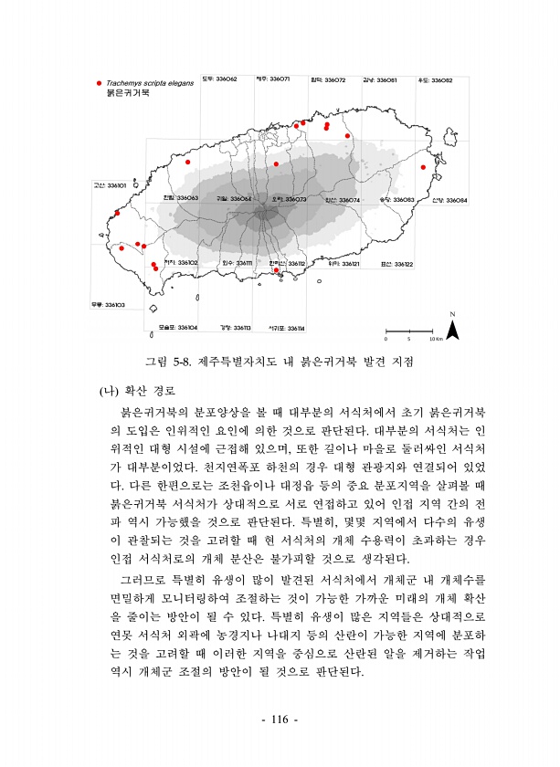 116 그림 5-8. 제주특별자치도 내 붉은귀거북 발견 지점 나 확산 경로 붉은귀거북의 분포양상을 볼 때 대부분의 서식처에서 초기 붉은귀거북 의 도입은 인위적인 요인에 의한 것으로 판단된다. 대부분의 서식처는 인 위적인 대형 시설에 근접해 있으며, 또한 길이나 마을로 둘러싸인 서식처 가 대부분이었다. 천지연폭포 하천의 경우 대형 관광지와 연결되어 있었 다. 다른 한편으로는 조천읍이나 대정읍 등의 중요 분포지역을 살펴볼 때 붉은귀거북 서식처가 상대적으로 서로 연접하고 있어 인접 지역 간의 전 파 역시 가능했을 것으로 판단된다. 특별히, 몇몇 지역에서 다수의 유생 이 관찰되는 것을 고려할 때 현 서식처의 개체 수용력이 초과하는 경우 인접 서식처로의 개체 분산은 불가피할 것으로 생각된다. 그러므로 특별히 유생이 ...