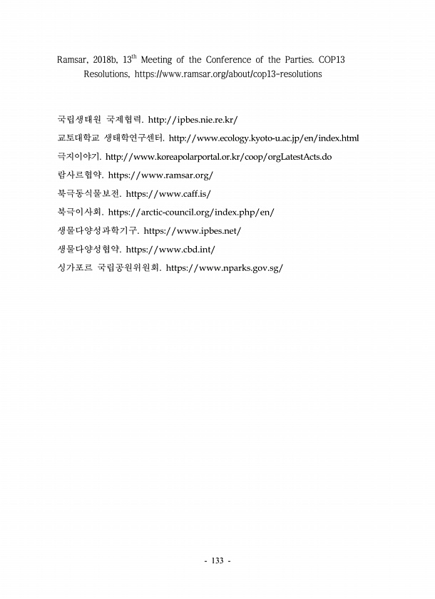 133 Ramsar, 2018b, 13th Meeting of the Conference of the Parties. COP13 Resolutions, https//www.ramsar.org/about/cop13-resolutions 국립생태원 국제협력. http//ipbes.nie.re.kr/ 교토대학교 생태학연구센터. http//www.ecology.kyoto-u.ac.jp/en/index.html 극지이야기. http//www.koreapolarportal.or.kr/coop/orgLatestActs.do 람사르협약. https//www.ramsar.org/ 북극동식물보전. https//www.caff.is/ 북극이사회. https//arctic-council.org/index.php/en/ 생물다양성...