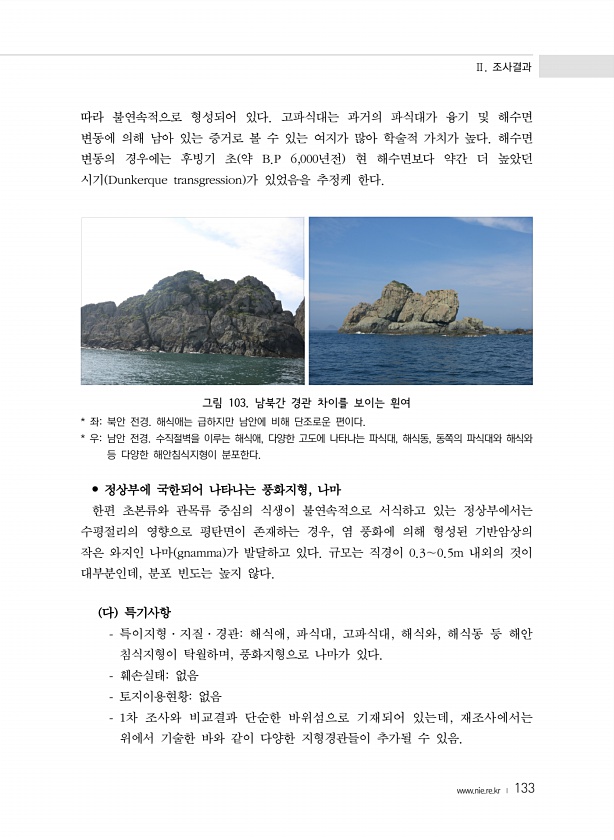 Ⅱ. 조사결과 www.nie.re.kr ? 133 따라 불연속적으로 형성되어 있다. 고파식대는 과거의 파식대가 융기 및 해수면 변동에 의해 남아 있는 증거로 볼 수 있는 여지가 많아 학술적 가치가 높다. 해수면 변동의 경우에는 후빙기 초 약 B.P 6,000년전 현 해수면보다 약간 더 높았던 시기 Dunkerque transgression 가 있었음을 추정케 한다. 그림 103. 남북간 경관 차이를 보이는 흰여 * 좌북안 전경. 해식애는 급하지만 남안에 비해 단조로운 편이다. * 우남안 전경. 수직절벽을 이루는 해식애, 다양한 고도에 나타나는 파식대, 해식동, 동쪽의 파식대와 해식와 등 다양한 해안침식지형이 분포한다. ? 정상부에 국한되어 나타나는 풍화지형, 나마 한편 초본류와 관목류 중심의 식생이 불연속적...