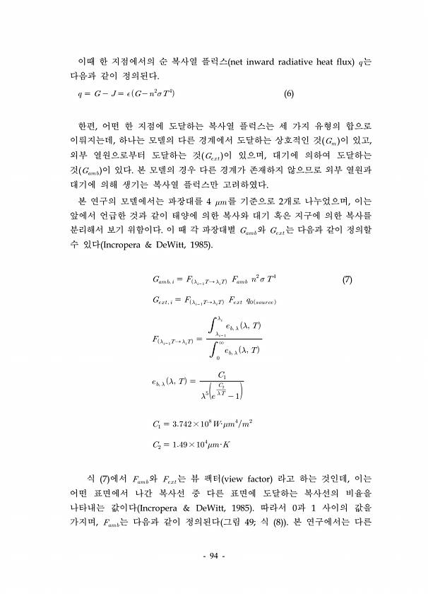 94 이때 한 지점에서의 순 복사열 플럭스 net inward radiative heat flux ?는 다음과 같이 정의된다. ? ? 6 한편, 어떤 한 지점에 도달하는 복사열 플럭스는 세 가지 유형의 합으로 이뤄지는데, 하나는 모델의 다른 경계에서 도달하는 상호적인 것 ? 이 있고, 외부 열원으로부터 도달하는 것 ??? 이 있으며, 대기에 의하여 도달하는 것 ?? ? 이 있다. 본 모델의 경우 다른 경계가 존재하지 않으므로 외부 열원과 대기에 의해 생기는 복사열 플럭스만 고려하였다. 본 연구의 모델에서는 파장대를 4 ?를 기준으로 2개로 나누었으며, 이는 앞에서 언급한 것과 같이 태양에 의한 복사와 대기 혹은 지구에 의한 복사를 분리해서 보기 위함이다. 이 ...