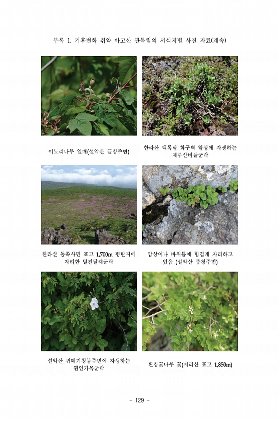 129 부록 1. 기후변화 취약 아고산 관목림의 서식지별 사진 자료 계속 이노리나무 열매 설악산 끝청주변 한라산 백록담 화구벽 암상에 자생하는 제주산버들군락 한라산 동쪽사면 표고 평탄지에 자리한 털진달래군락 암상이나 바위틈에 힘겹게 자리하고 있음 설악산 중청주변 설악산 귀떼기청봉주변에 자생하는 흰인가목군락 흰참꽃나무 꽃 지리산표고