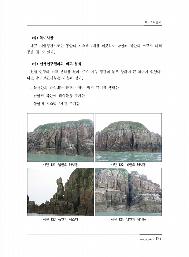 Ⅱ. 조사결과 www.nie.re.kr ? 129 라 특이사항 대표 지형경관으로는 동안의 시스텍 2개를 비롯하여 남안과 북안의 소규모 해식 동을 들 수 있다. 마 선행연구결과와 비교 분석 선행 연구와 비교 분석한 결과, 주요 지형 경관의 분포 상황이 큰 차이가 없었다. 다만 추가보완사항은 다음과 같다. 북서안의 파식대는 규모가 작아 별도 표기를 생략함. 남안과 북안에 해식동을 추가함. 동안에 시스텍 2개를 추가함. 사진 121. 남안의 해식동 사진 122. 북안의 해식동 사진 123. 동안의 시스텍 사진 124. 남안의해식동