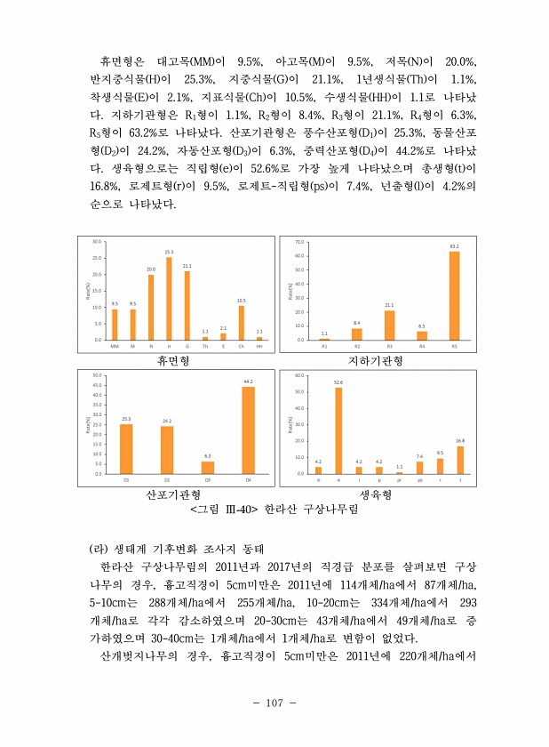107 휴면형은 대고목 MM 이 9.5%, 아고목 M 이 9.5%, 저목 N 이 20.0%, 반지중식물 H 이 25.3%, 지중식물 G 이 21.1%, 1년생식물 Th 이 1.1%, 착생식물 E 이 2.1%, 지표식물 Ch 이 10.5%, 수생식물 HH 이 1.1로 나타났 다. 지하기관형은 R1형이 1.1%, R2형이 8.4%, R3형이 21.1%, R4형이 6.3%, R5형이 63.2%로 나타났다. 산포기관형은 풍수산포형 D1 이 25.3%, 동물산포 형 D2 이 24.2%, 자동산포형 D3 이 6.3%, 중력산포형 D4 이 44.2%로 나타났 다. 생육형으로는 직립형 e 이 52.6%로 가장 높게 나타났으며 총생형 t 이 16.8%, 로제트형 r 이 9.5%, 로제트-직립형 ps 이 7.4%, 넌출형 l...