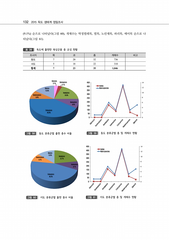 132 2015 독도 생태계 정밀조사 9.1% 순으로 나타났다 그림 60 , 개체수는 딱정벌레목, 벌목, 노린재목, 파리목, 매미목 순으로 나 타났다 그림 61 조사지 목 과 종 개체수 비고 동도 7 20 32 736 서도 5 18 22 310 합계 7 23 35 1,046 표 39 독도에 출현한 육상곤충 종 조성 현황 Odonata 3.1% Dermaptera 3.1% Hemiptera 18.8% Homoptera 9.4% Coleoptera 40.6% Hymenoptera 9.4% Diptera 15.6% 그림 58 동도 분류군별 출현 종수 비율 8 6 4 2 0 10 12 14 0 50 100 150 200 250 300 350 400 450 Indivi. Num.species 그림 59 동도 분류군별...