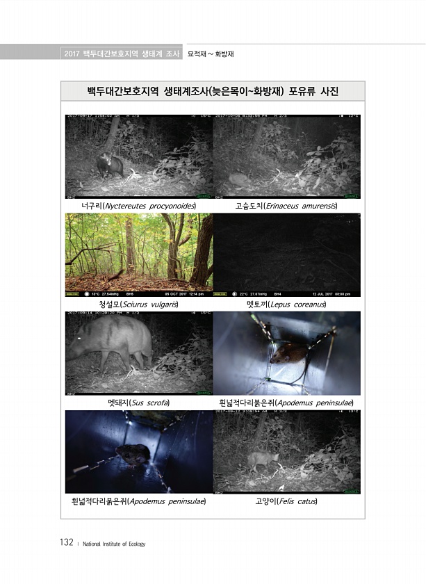 2017 백두대간보호지역 생태계 조사 묘적재 화방재 132 ? National Institute of Ecology 백두대간보호지역 생태계조사 늦은목이화방재 포유류 사진 너구리 Nyctereutes procyonoides 고슴도치 Erinaceus amurensis 청설모 Sciurus vulgaris 멧토끼 Lepus coreanus 멧돼지 Sus scrofa 흰넓적다리붉은쥐 Apodemus peninsulae 흰넓적다리붉은쥐 Apodemus peninsulae 고양이 Felis catus