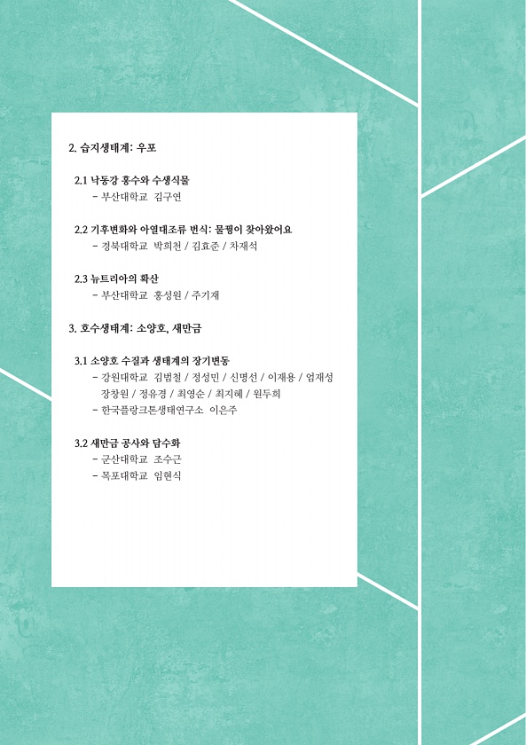 2. 습지생태계우포 2.1 낙동강 홍수와 수생식물 부산대학교 김구연 2.2 기후변화와 아열대조류 번식물꿩이 찾아왔어요 경북대학교 박희천 김효준 차재석 2.3 뉴트리아의 확산 부산대학교 홍성원 주기재 3. 호수생태계소양호, 새만금 3.1 소양호 수질과 생태계의 장기변동 강원대학교 김범철 정성민 신명선 이재용 엄재성 장창원 정유경 최영순 최지혜 원두희 한국플랑크톤생태연구소 이은주 3.2 새만금 공사와 담수화 군산대학교 조수근 목포대학교임현식