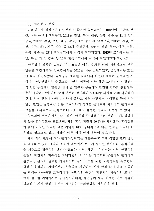 117 2 전국 분포 현황 2006년 6개 행정구역에서 서식이 확인된 뉴트리아는 2010년에는 경남, 부 산, 대구 등 9개 행정구역, 2011년 경남, 부산, 대구, 경북, 제주 등 11개 행정 구역, 2012년 경남, 부산, 대구, 경북, 제주 등 13개 행정구역, 2013년 경남, 부 산, 대구, 경북, 제주, 충북 등 15개 행정구역, 2014년 경남, 부산, 대구, 경북, 충북, 제주 등 25개 행정구역에서 서식이 확인되었다. 2015년 조사에서는 경 남, 부산, 대구, 경북 등 16개 행정구역에서 서식이 확인되었다 그림 45 낙동강에 정착한 뉴트리아는 2006년 이후, 수계를 따라 지속적으로 서식 범위를 확장하였다. 남한강에서는 2013년 처음 발견되었고, 금강에서는 2014 년 처음 확인되었다....