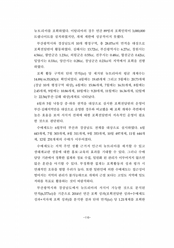 -116- 뉴트리아를 포획하였다. 이탈리아의 경우 연간 89명의 포획인력이 3,000,000 트랩나이트를 설치하였지만, 개체 제한에 성공적이지 못했다. 부산광역시와 경상남도의 10개 행정구역, 총 28.07㎢의 면적을 대상으로 포획전담반이 활동하였다. 김해시는 13.72㎢, 부산광역시는 6.27㎢, 창원시는 4.56㎢, 함안군은 1.23㎢, 의령군은 0.55㎢, 진주시는 0.48㎢, 합천군은 0.42㎢, 밀양시는 0.33㎢, 양산시는 0.28㎢, 창녕군은 0.23㎢의 지역에서 포획을 진행 하였다. 포획 활동 구역의 단위 면적 ㎢ 당 제거된 뉴트리아의 평균 개체수는 14.89 ±6.35,SD 로 확인되었다. 4월에는 19.45개체 그리고 5월에는 20.73개체 경남 10개 행정구역 대상 , 6월에는 15.86...
