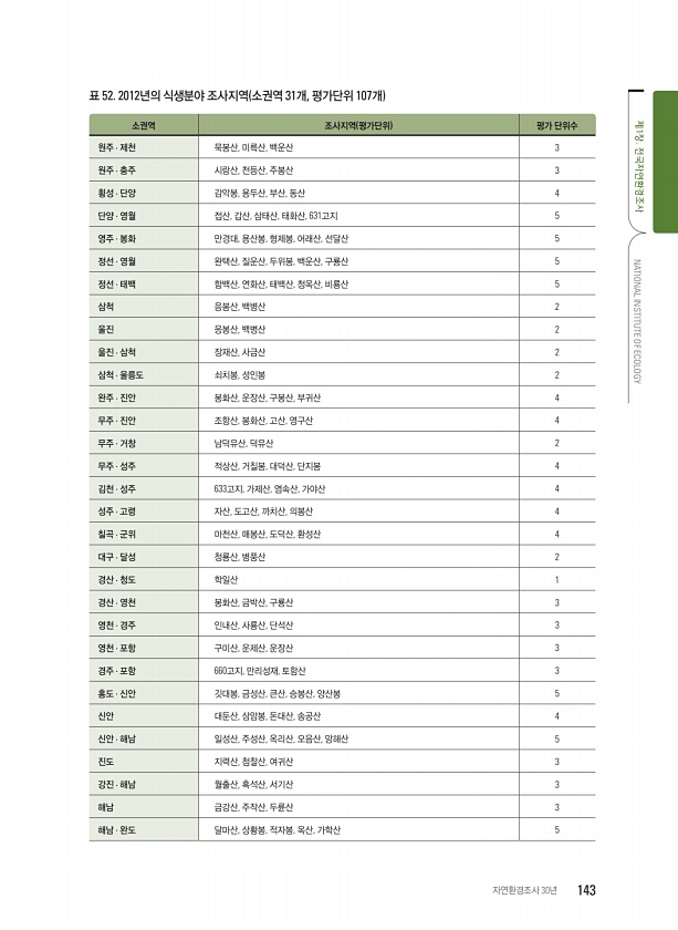 표 52. 2012년의 식생분야 조사지역 소권역 31개, 평가단위 107개 소권역 조사지역 평가단위 평가 단위수 원주 · 제천 묵봉산, 미륵산, 백운산 3 원주 · 충주 시랑산, 천등산, 주봉산 3 횡성 · 단양 감악봉, 용두산, 부산, 동산 4 단양 · 영월 접산, 갑산, 삼태산, 태화산, 631고지 5 영주 · 봉화 만경대, 용산봉, 형제봉, 어래산, 선달산 5 정선 · 영월 완택산, 질운산, 두위봉, 백운산, 구룡산 5 정선 · 태백 함백산, 연화산, 태백산, 청옥산, 비룡산 5 삼척 응봉산, 백병산 2 울진 응봉산, 백병산 2 울진 · 삼척 장재산, 사금산 2 삼척 · 울릉도 쇠치봉, 성인봉 2 완주 · 진안 봉화산, 운장산, 구봉산, 부귀산 4 무주 · 진안 조항산, 봉화산, 고산, 영구산 4 무주...