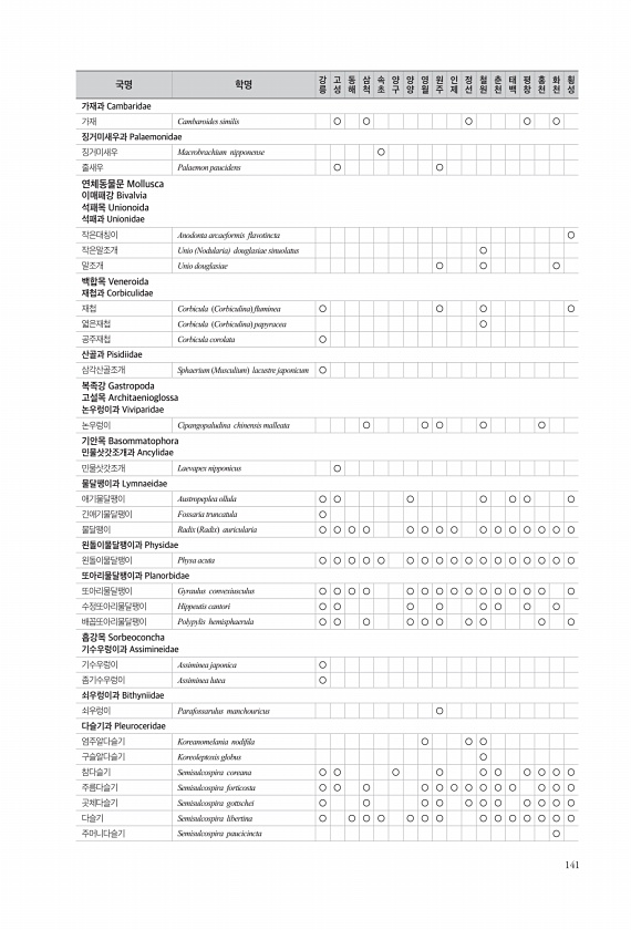 141 가재과 Cambaridae 가재 Cambaroides similis ○ ○ ○ ○ ○ 징거미새우과 Palaemonidae 징거미새우 Macrobrachium nipponense ○ 줄새우 Palaemon paucidens ○ ○ 연체동물문 Mollusca 이매패강 Bivalvia 석패목 Unionoida 석패과 Unionidae 작은대칭이 Anodonta arcaeformis favotincta ○ 작은말조개 Unio Nodularia douglasiae sinuolatus ○ 말조개 Unio douglasiae ○ ○ ○ 백합목 Veneroida 재첩과 Corbiculidae 재첩 Corbicula Corbiculina fuminea ○ ○ ○ ○ 엷은재첩 Corbicula Corbiculina p...