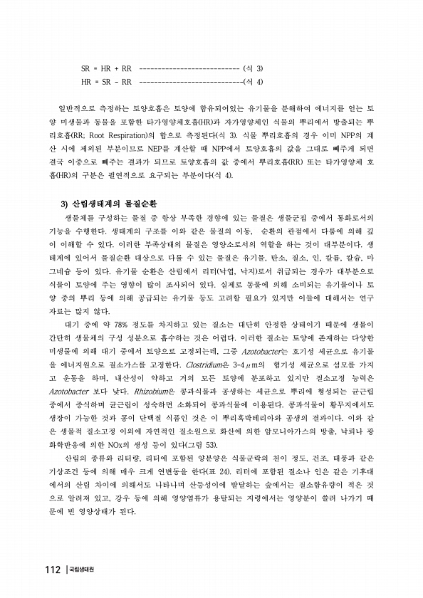 SR = HR + RR --------------------------- 식 3 HR = SR RR ---------------------------- 식 4 일반적으로 측정하는 토양호흡은 토양에 함유되어있는 유기물을 분해하여 에너지를 얻는 토 양 미생물과 동물을 포함한 타가영양체호흡 HR 과 자가영양체인 식물의 뿌리에서 방출되는 뿌 리호흡 RR; Root Respiration 의 합으로 측정된다 식 3 식물 뿌리호흡의 경우 이미 NPP의 계 산 시에 제외된 부분이므로 NEP를 계산할 때 NPP에서 토양호흡의 값을 그대로 빼주게 되면 결국 이중으로 빼주는 결과가 되므로 토양호흡의 값 중에서 뿌리호흡 RR 또는 타가영양체 호 흡 HR 의 구분은 필연적으로 요구되는 부분이다 식 4 산림생태계의 물질순환 생물체를...