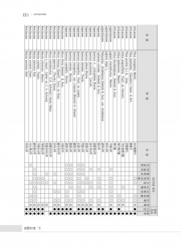 133 과 명 학 명 국 명 2015년 조사 문헌 조사 지경천 마달리 명파리 큰까치봉 고성 사양제 인북천 향로봉 인제 전체 12 년 동부 Urticaceae Pilea mongolica Wedd. 모시물통이 ? ? ? ? ◎ ● ● Urticaceae Pilea peploides Gaudich. Hook. & Arn. 물통이 ● Urticaceae Pilea pumila L. A. Gray 큰물통이 ● Urticaceae Urtica angustifolia Fisch. ex Hornem. 가는잎쐐기풀 ? ? ◎ ● Urticaceae Urtica laetevirens Maxim. 애기쐐기풀 ...