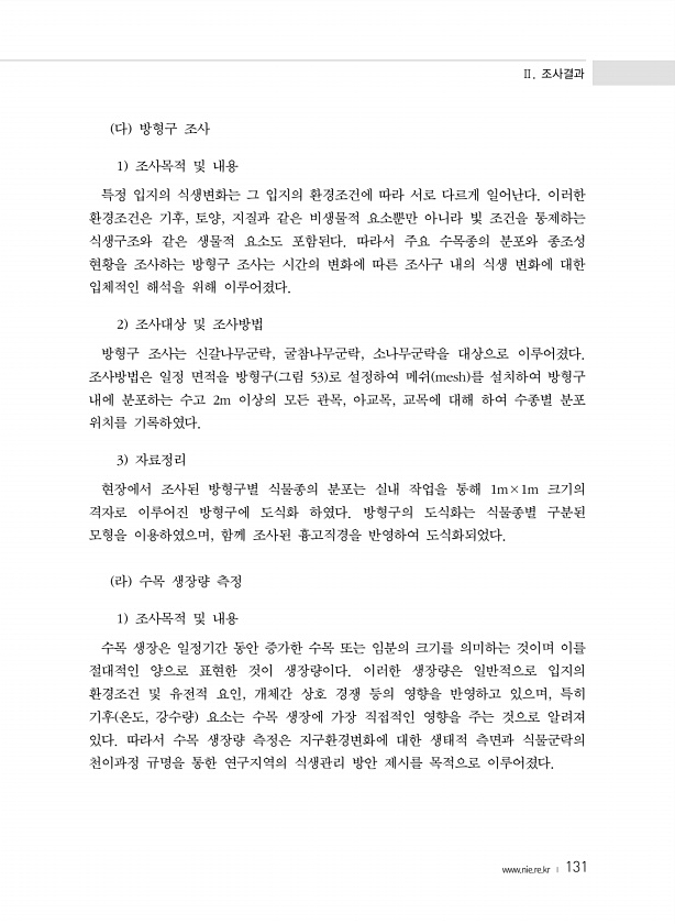 Ⅱ. 조사결과 www.nie.re.kr ? 131 다 방형구 조사 1 조사목적 및 내용 특정 입지의 식생변화는 그 입지의 환경조건에 따라 서로 다르게 일어난다. 이러한 환경조건은 기후, 토양, 지질과 같은 비생물적 요소뿐만 아니라 빛 조건을 통제하는 식생구조와 같은 생물적 요소도 포함된다. 따라서 주요 수목종의 분포와 종조성 현황을 조사하는 방형구 조사는 시간의 변화에 따른 조사구 내의 식생 변화에 대한 입체적인 해석을 위해 이루어졌다. 2 조사대상 및 조사방법 방형구 조사는 신갈나무군락, 굴참나무군락, 소나무군락을 대상으로 이루어졌다. 조사방법은 일정 면적을 방형구 그림 53 로 설정하여 메쉬 mesh 를 설치하여 방형구 내에 분포하는 수고 2m 이상의 모든 관목, 아교목, 교목에 대해 하여 수종별 분포 ...