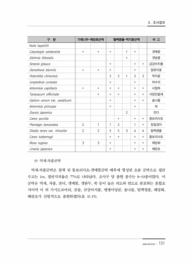Ⅱ. 조사결과 www.nie.re.kr ? 131 구 분 가래나무-해당화군락 털백령풀-딱지꽃군락 비 고 Herb layer H Calystegia soldanella + + + 1 + 갯메꽃 Glehnia littoralis + 갯방풍 Setaria glauca + + + 금강아지풀 Oenothera biennis + + + + 달맞이꽃 Potentilla chinensis 2 2 1 2 2 딱지꽃 Lespedeza cuneata + + 비수리 Artemisia capillaris + + + + + + 사철쑥 Taraxacum officinale + + + + + 서양민들레 Galium verum var. asiaticum + + + 솔나물 A...