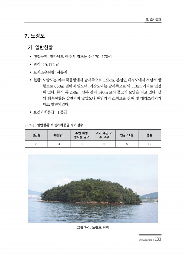 II. 조사결과 www.nie.re.kr ?133 7. ? 행정구역전라남도 여수시 경호동 산 170, 170-1 ? 면적15,174 ㎡ ? 토지소유현황사유지 ? 현황노랑도는 여수 국동항에서 남서쪽으로 1.9km, 본섬인 대경도에서 서남서 방 향으로 650m 떨어져 있으며, 가장도와는 남서쪽으로 약 110m 거리로 인접 해 있다. 동서 폭 250m, 남북 길이 140m 로서 물고기 모양을 띠고 있다. 섬 의 훼손현황은 발견되지 않았으나 해안가의 스치로풀 잔해 및 해양쓰레기가 다소 발견되었다. ? 보전가치등급Ⅰ등급 접근성 훼손정도 주변 해양 양식장 규모 과거 주민 거 주 여부 인공구조물 총점 3 3 3 5 5 19 표 7-1. 일반현황 보전가치등급 평가점수 그림 7-1. 노랑도전경