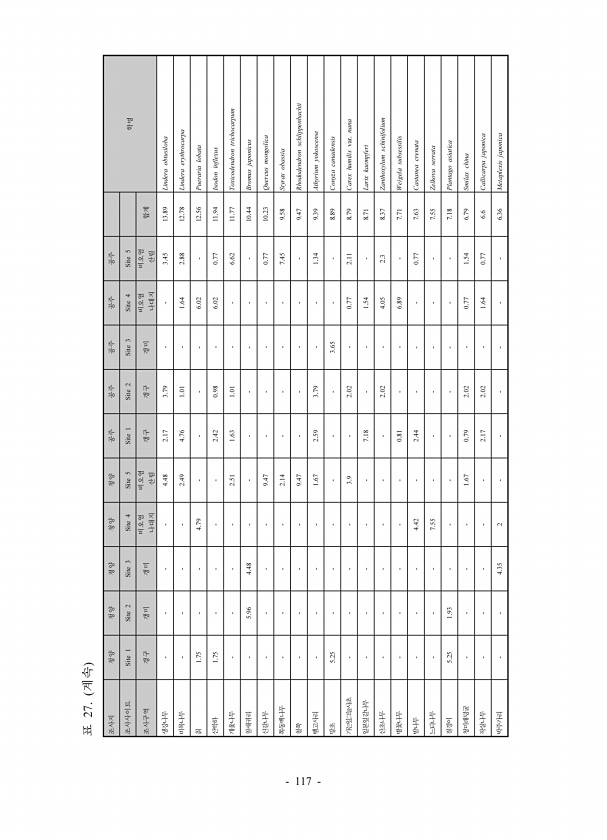 117 Site 1 Site 2 Site 3 Site 4 Site 5 Site 1 Site 2 Site 3 Site 4 Site 5 4.48 2.17 3.79 3.45 13.89 Lindera obtusiloba 2.49 4.76 1.01 1.64 2.88 12.78 Lindera erythrocarpa 1.75 4.79 6.02 12.56 Pueraria lobata 1.75 2.42 0.98 6.02 0.77 11.94 Isodon inflexus 2.51 1.63 1.01 6.62 11.77 Toxicodendron trichocarpum 5.96 4.48 10.44 Bromus japonicus 9.47 0.77 10.23 Quercus mongolica 2.14 7.45 9.58 Styrax oba...