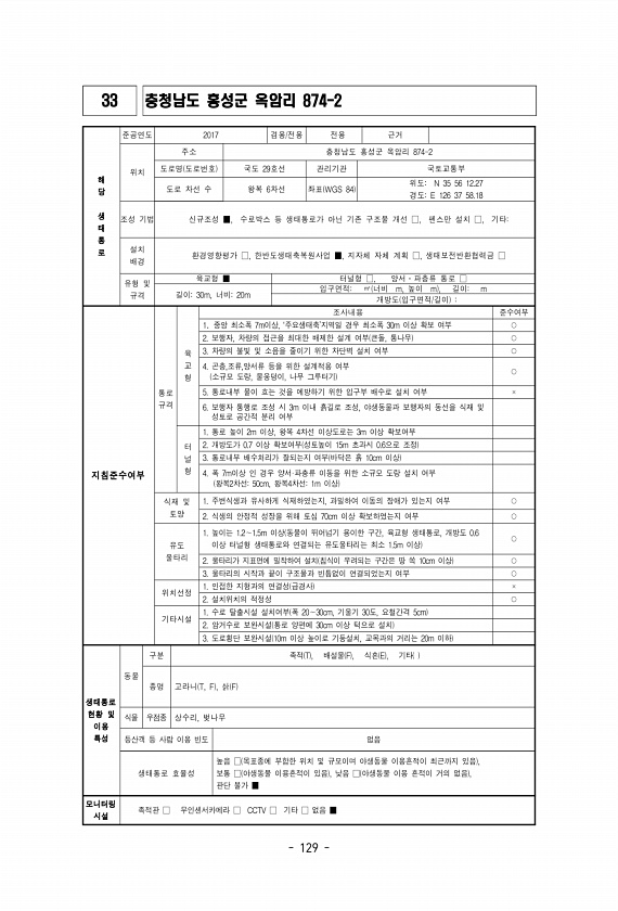 129 33 충청남도 홍성군 옥암리 874-2 해 당 생 태 통 로 준공연도 2017 겸용/전용 전용 근거 위치 주소 충청남도 홍성군 옥암리 874-2 도로명 도로번호 국도 29호선 관리기관 국토교통부 도로 차선 수 왕복 6차선 좌표 WGS 84 위도N 35 56 12.27 경도E 126 37 58.18 조성 기법 신규조성 ■, 수로박스 등 생태통로가 아닌 기존 구조물 개선 □, 펜스만 설치 □, 기타설치 배경 환경영향평가 □, 한반도생태축복원사업 ■, 지자체 자체 계획 □, 생태보전반환협력금 □ 유형 및 규격 육교형 ■ 터널형 □, 양서?파충류 통로 □ 길이30m, 너비20m 입구면적㎡ 너비 m, 높이 m , 길이m 개방도 입구면적/길이 지침준수여부 통로 규격 육 교 형 조사내용 준수여부 1.중앙 최소폭 ...