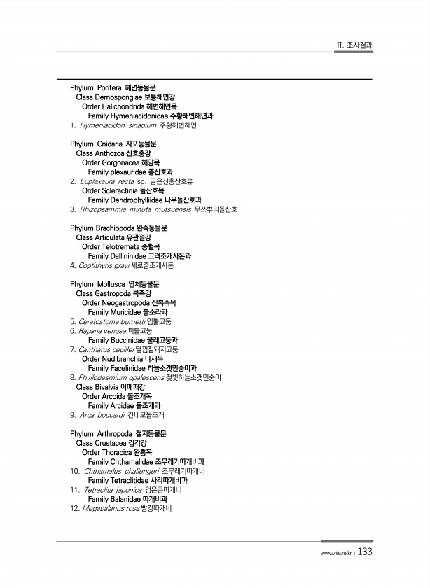 II. 조사결과 www.nie.re.kr ?133 Phylum Porifera 해면동물문 Class Demospongiae 보통해면강 Order Halichondrida 해변해면목 Family Hymeniacidonidae 주황해변해면과 1. Hymeniacidon sinapium 주황해변해면 Phylum Cnidaria 자포동물문 Class Anthozoa 산호충강 Order Gorgonacea 해양목 Family plexauridae 총산호과 2. Euplexaura recta sp. 곧은진총산호류 Order Scleractinia 돌산호목 Family Dendrophylliidae 나무돌산호과 3. Rhizopsammia minuta mutsuensis 무쓰뿌리돌산호 Phylum Brachiopoda ...