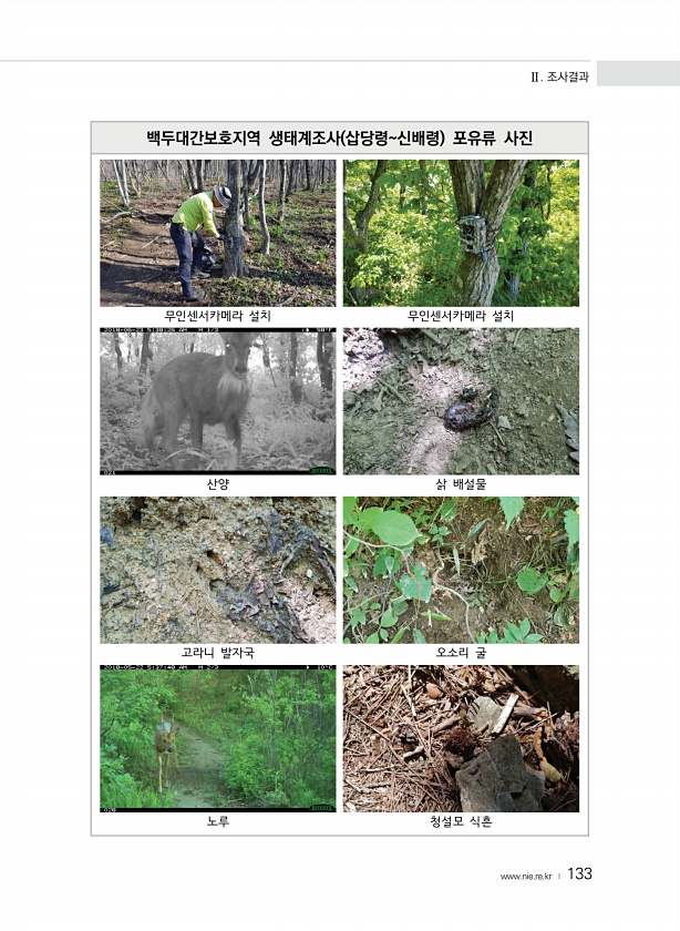 Ⅱ. 조사결과 www.nie.re.kr ? 133 백두대간보호지역 생태계조사 삽당령신배령 포유류 사진 무인센서카메라 설치 무인센서카메라 설치 산양 삵 배설물 고라니 발자국 오소리 굴 노루 청설모식흔