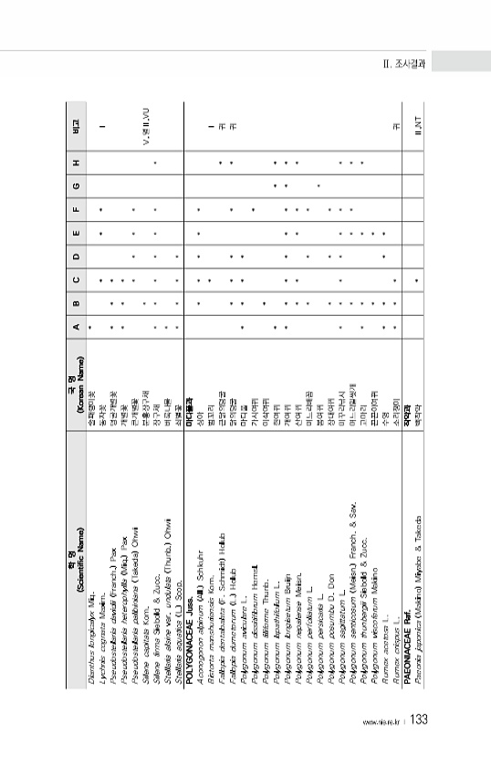 www ·nie·re·kr ? 133 학 명 Scientific Name 국 명 Korean Name A B C D E F G H 비고 Dianthus longicalyx Miq. 술패랭이꽃 * Lychnis cognata Maxim. 동자꽃 * * * Ⅰ Pseudostellaria davidii Franch. Pax 덩굴개별꽃 * * * Pseudostellaria heterophylla Miq. Pax 개별꽃 * * * Pseudostellaria palibiniana Takeda Ohwi 큰개별꽃 * * * * Silene capitata Kom. 분홍장구채 * Ⅴ,멸Ⅱ,VU Silene firma Siebold & Zucc. 장구채 * * * * * * * Stellaria alsine var. u...