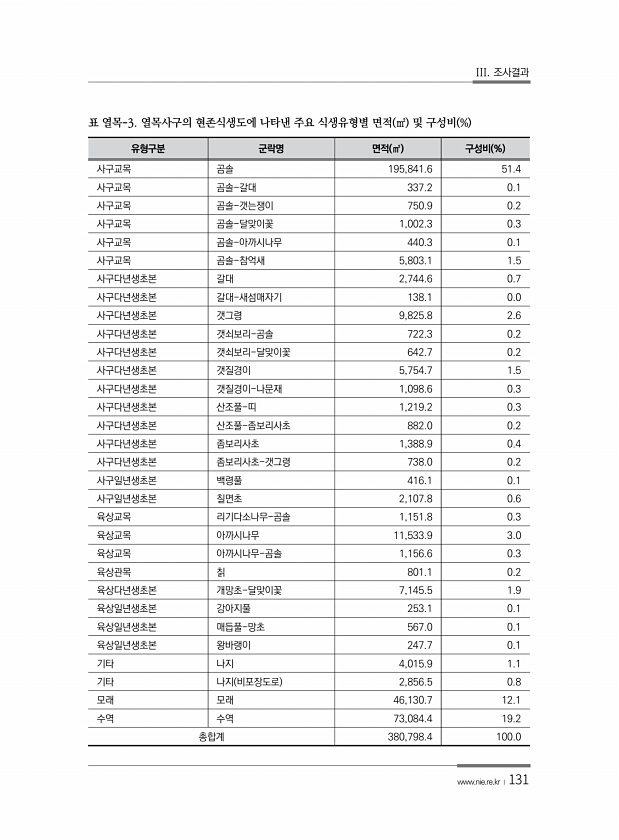 III. 조사결과 www.nie.re.kr ?131 유형구분 군락명 면적 ㎡ 구성비 % 사구교목 곰솔 195,841.6 51.4 사구교목 곰솔-갈대 337.2 0.1 사구교목 곰솔-갯는쟁이 750.9 0.2 사구교목 곰솔-달맞이꽃 1,002.3 0.3 사구교목 곰솔-아까시나무 440.3 0.1 사구교목 곰솔-참억새 5,803.1 1.5 사구다년생초본 갈대 2,744.6 0.7 사구다년생초본 갈대-새섬매자기 138.1 0.0 사구다년생초본 갯그령 9,825.8 2.6 사구다년생초본 갯쇠보리-곰솔 722.3 0.2 사구다년생초본 갯쇠보리-달맞이꽃 642.7 0.2 사구다년생초본 갯질경이 5,754.7 1.5 사구다년생초본 갯질경이-나문재 1,098.6 0.3 사구다년생초본 산조풀-띠 1,219.2 0.3 사구다...