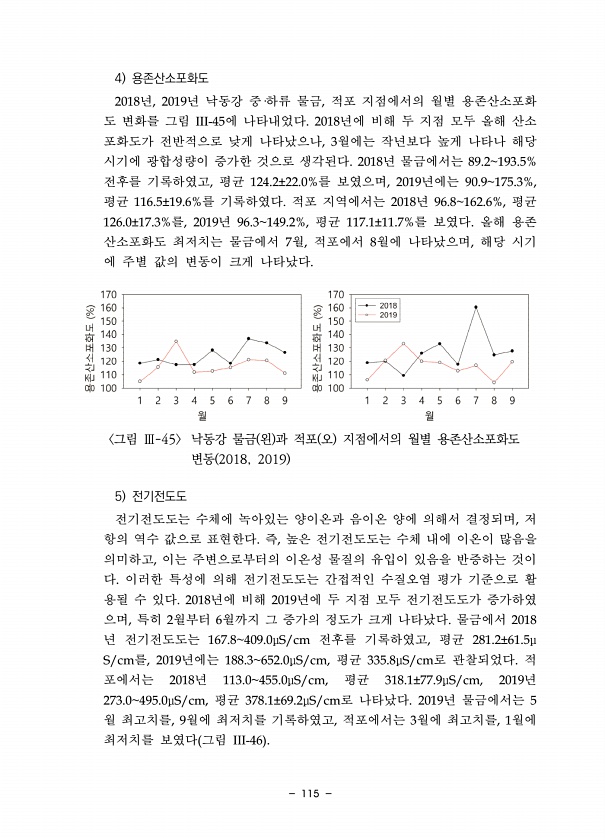 115 4 용존산소포화도 2018년, 2019년 낙동강 중·하류 물금, 적포 지점에서의 월별 용존산소포화 도 변화를 그림 III-45에 나타내었다. 2018년에 비해 두 지점 모두 올해 산소 포화도가 전반적으로 낮게 나타났으나, 3월에는 작년보다 높게 나타나 해당 시기에 광합성량이 증가한 것으로 생각된다. 2018년 물금에서는 89.2193.5% 전후를 기록하였고, 평균 124.2±22.0%를 보였으며, 2019년에는 90.9175.3%, 평균 116.5±19.6%를 기록하였다. 적포 지역에서는 2018년 96.8162.6%, 평균 126.0±17.3%를, 2019년 96.3149.2%, 평균 117.1±11.7%를 보였다. 올해 용존 산소포화도 최저치는 물금에서 7월, 적포에서 8월에 나타났으며, 해당 시...