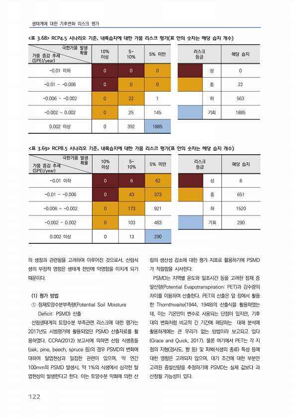 생태계에 대한 기후변화 리스크 평가 122 의 생장과 관련됨을 고려하여 이루어진 것으로서, 산림식 생의 부정적 영향은 생태계 전반에 악영향을 미치게 되기 때문이다. 1 평가 방법 ① 잠재토양수분부족량 Potential Soil Moisture DeficitPSMD 산출 산림생태계의 토양수분 부족관련 리스크에 대한 평가는 2017년도 시범평가에 활용되었던 PSMD 산출자료를 활 용하였다. CCRA 2012 보고서에 의하면 산림 식생종들 oak, pine, beech, spruce 등 의 경우 PSMD의 변화에 대하여 탈엽현상과 밀접한 관련이 있으며, 약 연간 100mm의 PSMD 발생시, 약 1%의 식생에서 심각한 탈 엽현상이 발생한다고 한다. 이는 토양수분 악화에 의한 산 림의 생산성 감소에 대한 평가 지표...