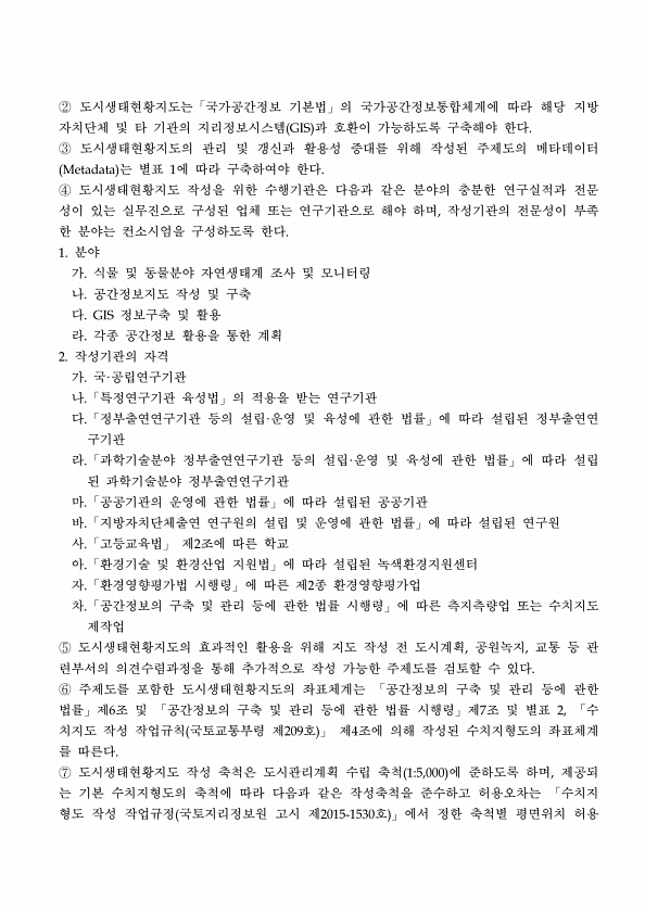 ② 도시생태현황지도는「국가공간정보 기본법」의 국가공간정보통합체계에 따라 해당 지방 자치단체 및 타 기관의 지리정보시스템 GIS 과 호환이 가능하도록 구축해야 한다. ③ 도시생태현황지도의 관리 및 갱신과 활용성 증대를 위해 작성된 주제도의 메타데이터 Metadata 는 별표 1에 따라 구축하여야 한다. ④ 도시생태현황지도 작성을 위한 수행기관은 다음과 같은 분야의 충분한 연구실적과 전문 성이 있는 실무진으로 구성된 업체 또는 연구기관으로 해야 하며, 작성기관의 전문성이 부족 한 분야는 컨소시엄을 구성하도록 한다. 1. 분야 가. 식물 및 동물분야 자연생태계 조사 및 모니터링 나. 공간정보지도 작성 및 구축 다. GIS 정보구축 및 활용 라. 각종 공간정보 활용을 통한 계획 2. 작성기관의 자격 가. 국·공립연...