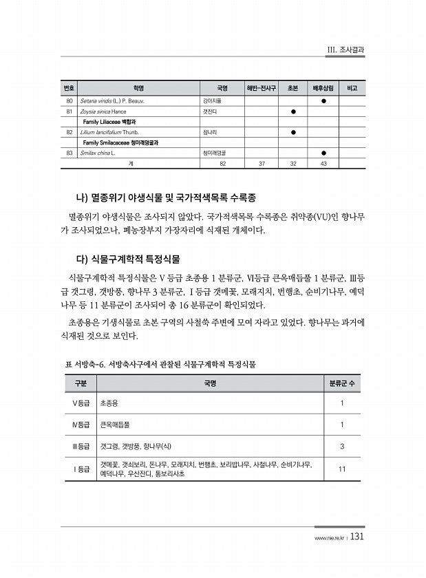 III. 조사결과 www.nie.re.kr ?131 멸종위기 야생식물은 조사되지 않았다. 국가적색목록 수록종은 취약종 VU 인 향나무 가 조사되었으나, 폐농장부지 가장자리에 식재된 개체이다. 식물구계학적 특정식물은 V 등급 초종용 1 분류군, Ⅵ등급 큰옥매듭풀 1 분류군, Ⅲ등 급 갯그령, 갯방풍, 향나무 3 분류군, Ⅰ등급 갯메꽃, 모래지치, 번행초, 순비기나무, 예덕 나무 등 11 분류군이 조사되어 총 16 분류군이 확인되었다. 초종용은 기생식물로 초본 구역의 사철쑥 주변에 모여 자라고 있었다. 향나무는 과거에 식재된 것으로 보인다. 구분 국명 분류군 수 Ⅴ등급 초종용 1 Ⅳ등급 큰옥매듭풀 1 Ⅲ등급 갯그령, 갯방풍, 향나무 식 3 Ⅰ등급 갯메꽃, 갯쇠보리, 돈나무, 모래지치, 번행초, 보리밥나무, 사철...